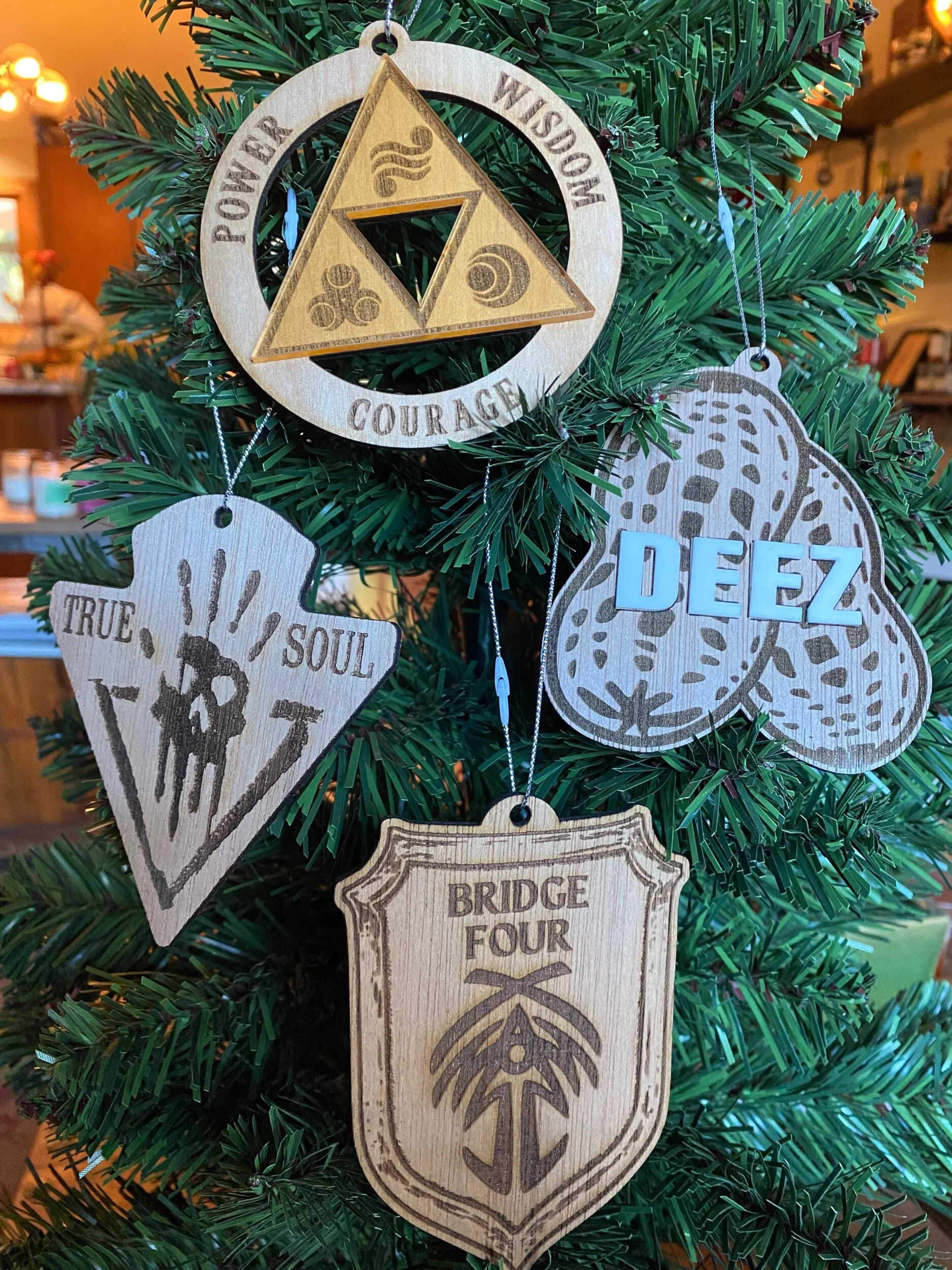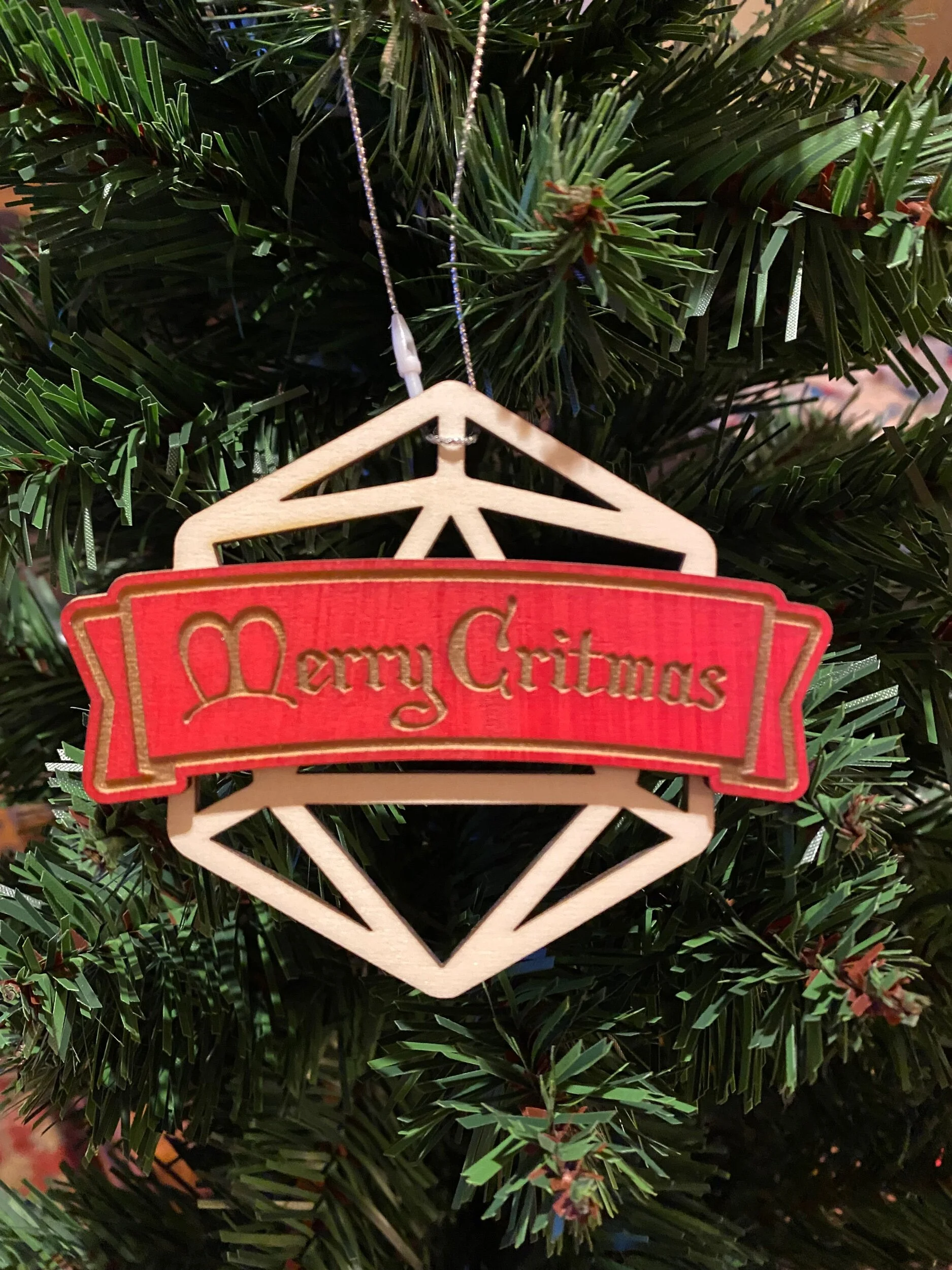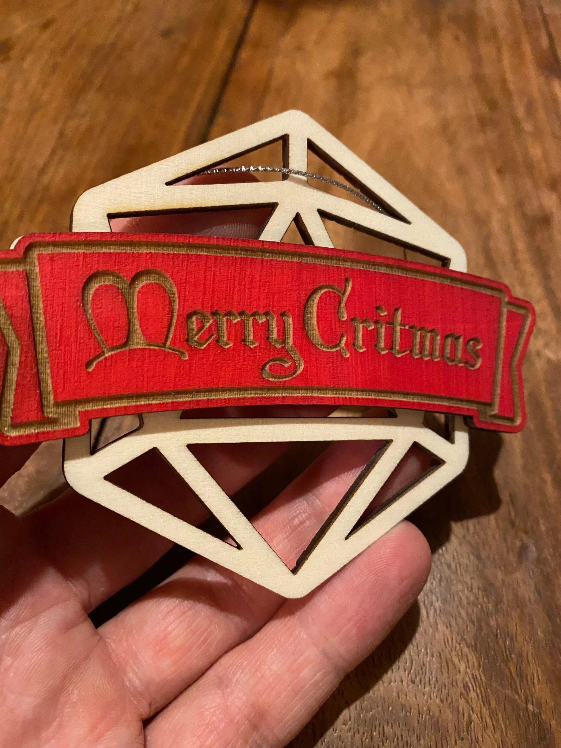 Hand designed and precision cut, each 2 layered ornament has a cutout outline of a D20, and a separate top red banner that’s engraved with the beloved “Merry Critmas” phrase.